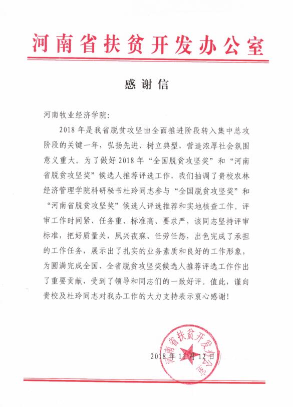 近日,河南省扶贫开发办公室给我校发来感谢信,感谢我校及农林经济管理学院杜玲老师对我省扶贫工作的大力支持。