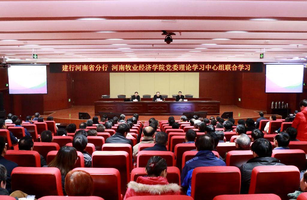 12月12日上午,我校与建行河南省分行在学校龙子湖校区图书馆一楼报告厅召开党委理论学习中心组联合学习扩大会。会议由校党委书记穆瑞杰主持,建行河南省分行党委书记、行长石永拴和我校党委副书记、校长罗士喜分别作主题发言。双方党委理论学习中心组成员,以及建行河南省分行本部部门主要负责人、建行河南自贸区分行理论学习中心组成员、我校中层正职干部参加了会议。