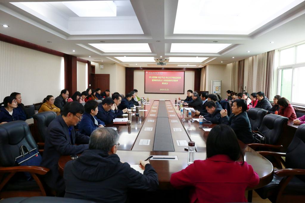 下午,学校在英才校区行政楼五楼会议室召开学习贯彻习近平总书记在学校思想政治理论课教师座谈会上的重要讲话精神座谈会。座谈会邀请了参加中央座谈会的河南省教师代表、漯河食品职业学院党委副书记程东阳教授和我校特聘思想政治理论课卓越教师、郑州大学程明欣教授参加。校领导穆瑞杰、罗士喜、李绍文、许圣道出席会议,党政办、宣传部、教务处、马克思主义学院负责人以及思想政治理论课专兼职教师共40余人参加座谈会。会议由校党委副书记、工会主席李绍文主持。