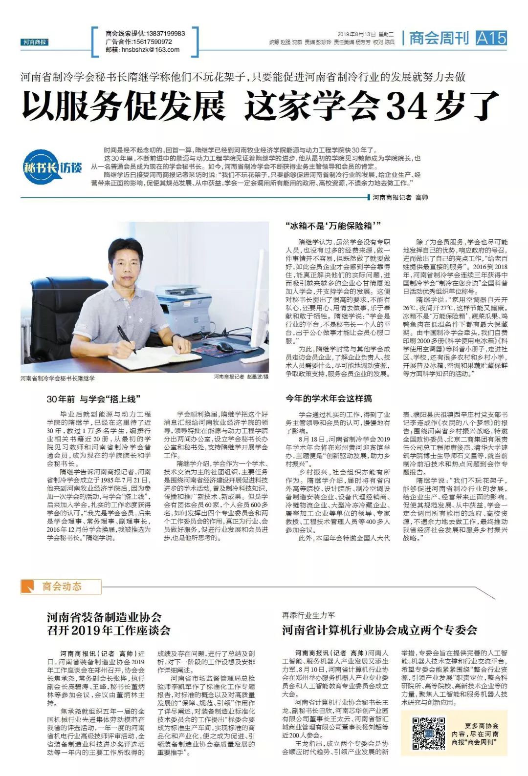 近日,《河南商报》以《以服务促发展 这家学会34岁了》为题报道了我校能源与动力工程学院院长兼河南省制冷学会秘书长隋继学在学校的大力支持下,响应政府号召,发挥专业优势,带领学会服务行业发展,促进科技进步等相关事迹。