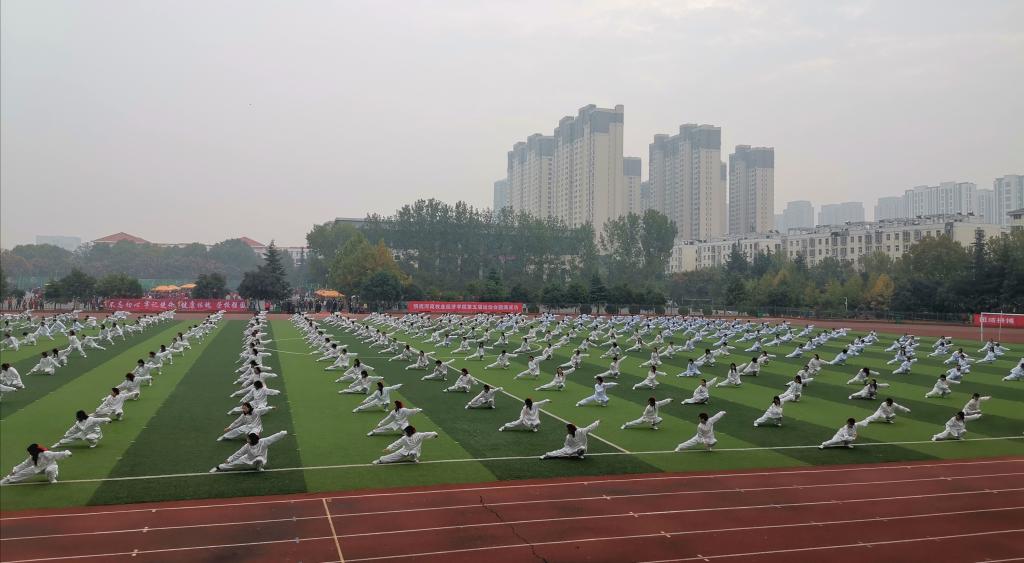 在全场观众的欢呼声中,来自各学院的1400名学生进行了太极拳、陈式太极拳、学院健美操队、集体舞《我爱你中国》表演。简化二十四式太极拳运动员动作舒展大方,刚柔相济,极尽文人雅士之气;陈式太极拳表演舒展大方,中正自然,刚强有力;健美操运动员表现出了“健康、欢乐、昂扬、向上”的时代风貌,展示了朝气蓬勃、奋发向上的精神风貌。以建国七十周年为主题,通过彩扇变化和队形变换的集体舞蹈 《我爱你中国》,表达了我校师生对建国七十年的自豪与骄傲,祝福伟大的祖国繁荣富强,人民幸福安康。表演场面恢宏壮观、震撼人心,将我校学生的激情与活力表现得淋漓尽致,绽放出蓬勃生机和无限魅力。
