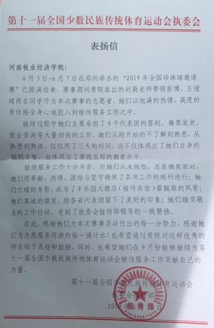 近日,中共河南省委、河南省人民政府下发了《中共河南省委、河南省人民政府关于奖励和通报第十一届全国少数民族传统体育运动会筹办工作中表现突出单位和个人的决定》(豫文〔2019〕147号),对在2019年9月8日至16日第十一届全国少数民族传统体育运动会中表现突出的志愿者和干部群众予以奖励和通报,我校荣获“集体嘉奖”;校团委副书记王鑫磊荣获“个人嘉奖”;动物科技学院的王密、旅游学院的刘蕤、张琳婧和动物医药学院的付文凯四位辅导员老师被通报表扬。(宣传部 田景丽/文 团委 杨莉/图)
