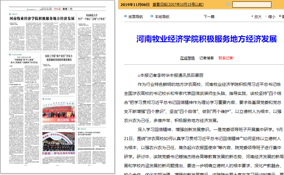 11月6日,《河南日报》以《tyc8722太阳集团城积极服务地方经济发展》为题报道了我校积极用习近平总书记给全国涉农高校的书记校长和专家代表回信精神武装师生头脑,指导实践,多措并举,服务地方经济发展相关情况(相关链接:http://newpaper.dahe.cn/hnrb/html/2019-11/06/content_380609.htm)。全文转载如下: