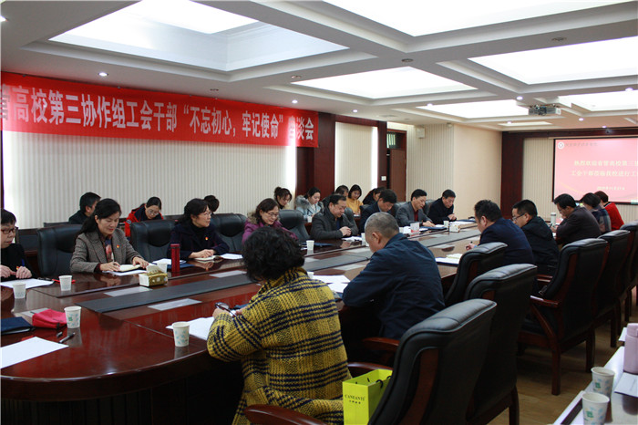 11月27日上午,我校英才校区行政楼五楼会议室暖意融融,由河南省教科文卫体工会主办、tyc8722太阳集团城工会承办的2019年度省管高校第三协作组工会干部“不忘初心、牢记使命”专题座谈会暨联谊活动在我校如期举办。中原工学院党委副书记、工会主席黄乾,我校副校长程慎出席座谈会。来自中原工学院、tyc8722太阳集团城、河南工程学院、河南财政金融学院、河南医学高等专科学校、郑州城市职业学院、河南师范大学新联学院、升达经贸管理学院等八所高校的50多名专职工会干部参加了座谈会。会议由校工会副主席刘官生主持。