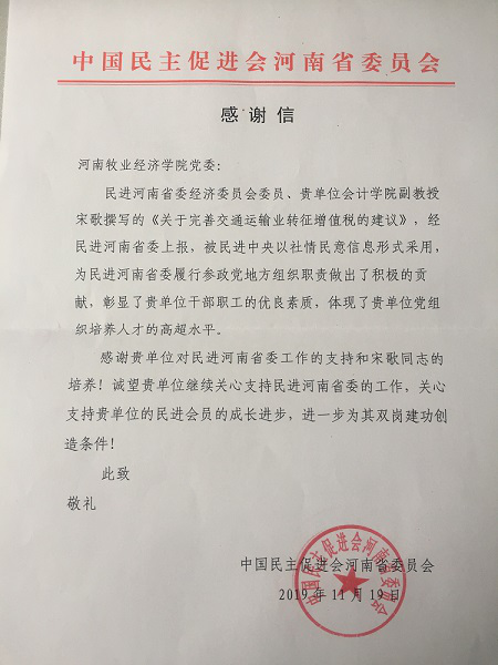 近日,从中国民主促进会河南省委员会传来消息,民进tyc8722太阳集团城支部会员、金融与会计学院宋歌副教授撰写的《关于完善交通运输业转征增值税的建议》被民进中央采用。