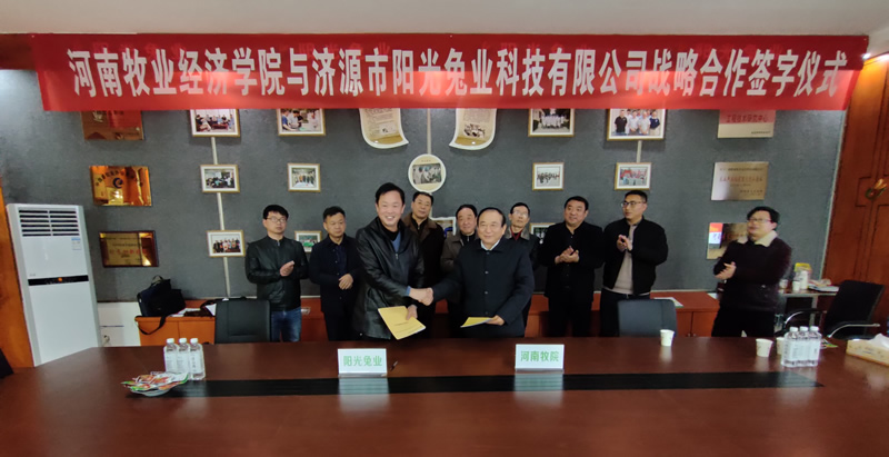 11月27日,我校与河南阳光兔业科技有限公司战略合作框架协议签约仪式在河南阳光兔业科技有限公司总部举行。我校副校长张卫宪,济源产城融合示范区、济源市政府副秘书长张北平,河南阳光兔业科技有限公司董事长段天奎,总经理王金华,动物医药学院党委书记刘永录,动物科技学院院长席磊出席签约仪式。社会服务办公室主任胡迎利主持签约仪式。