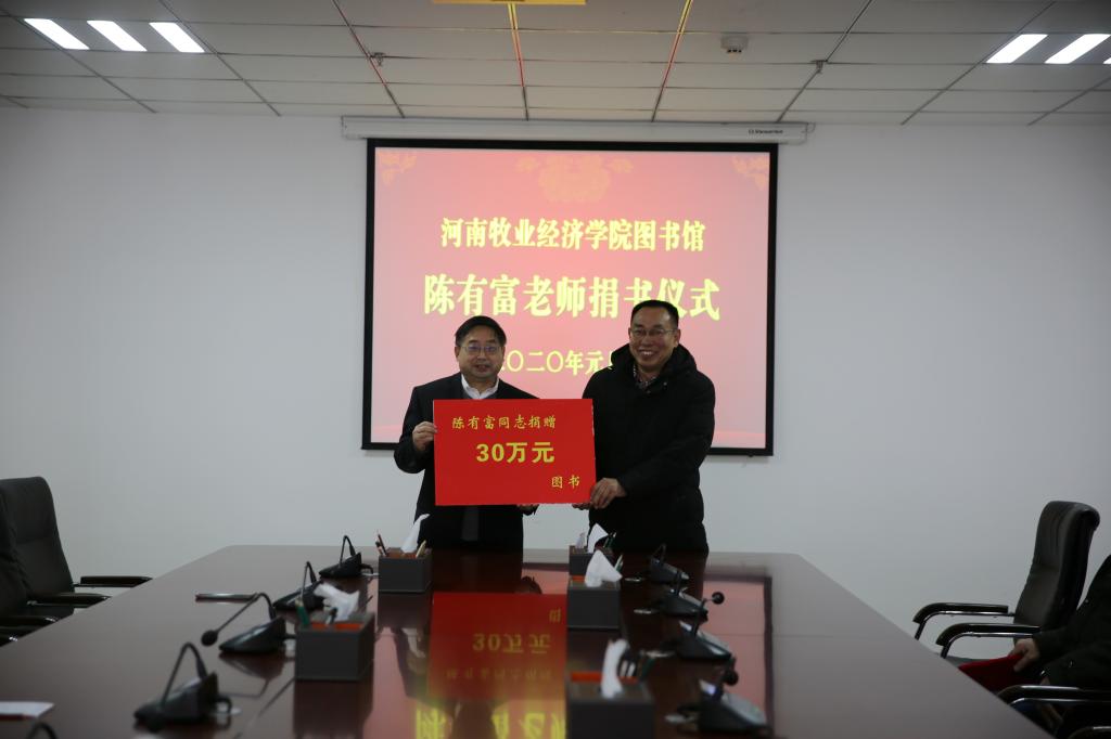 1月3日,学校在龙子湖校区图书馆841会议室举行陈有富老师捐书仪式,校长罗士喜、副校长陈艳、图书馆陈有富老师、校长办公室主任贾江,图书馆党委书记牛建绥、馆长张广芝等参加了仪式。