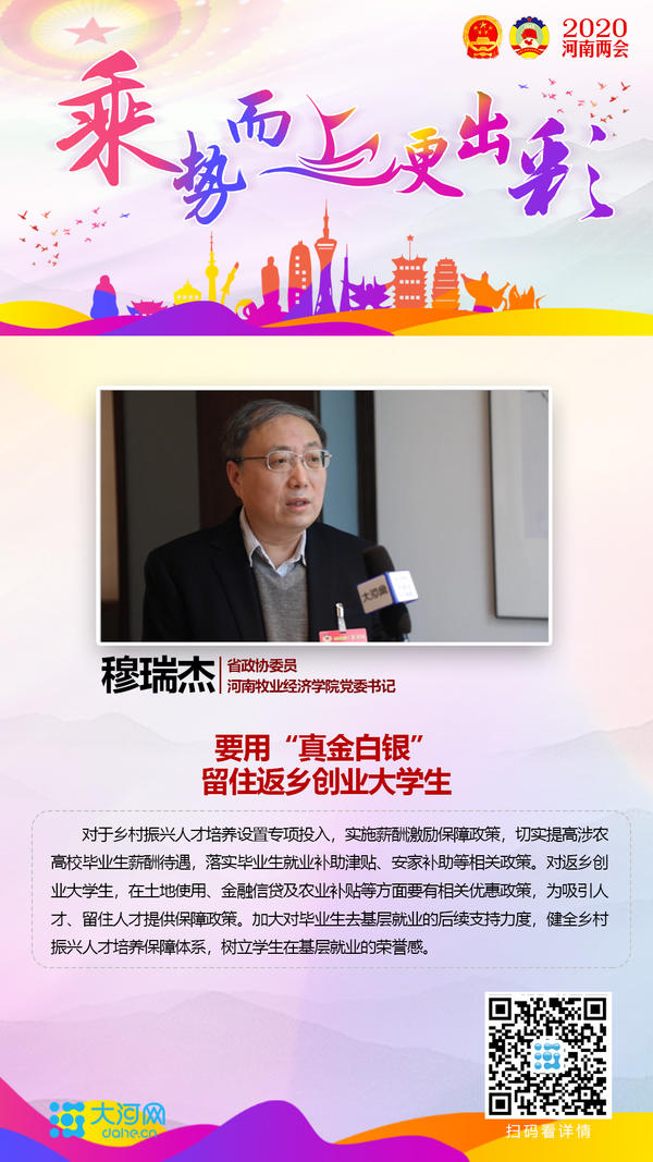 1月10日,省政协委员、校党委书记穆瑞杰参加省政协十二届三次会议时接受大河网采访(相关链接:https://news.dahe.cn/2020/01-10/577852.html),表示要做好农村人才的培养,用“真金白银”留住返乡创业大学生。对于乡村振兴人才培养设置专项投入,实施薪酬激励保障政策,切实提高涉农高校毕业生薪酬待遇,落实毕业生就业补助津贴、安家补助等相关政策。对返乡创业大学生,在土地使用、金融信贷及农业补贴等方面要有相关优惠政策,为吸引人才、留住人才提供保障政策。加大对毕业生去基层就业的后续支持力度,健全乡村振兴人才培养保障体系,树立学生在基层就业的荣誉感。河南省人民政府网(相关链接:https://www.henan.gov.cn/2020/01-11/1245229.html)等媒体进行了转载,现将全文转发如下: