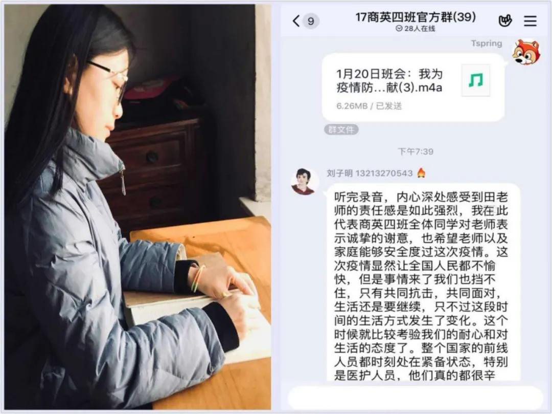 辅导员田春霞利用网络开展线上班会并认真记录学生信息 |