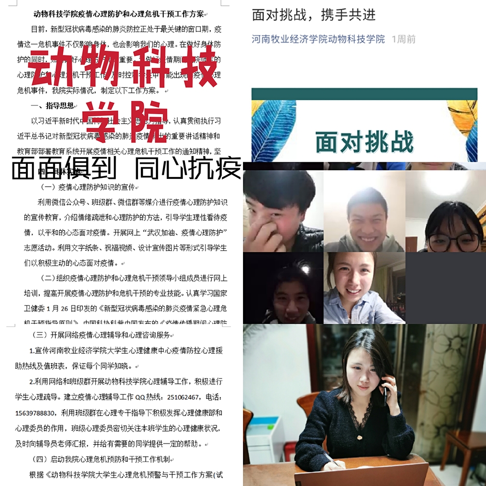 动物科技学院成立疫情心理防护和危机干预领导小组,通过疫情心理健康知识的教育和宣传,加强学生对疫情危机的了解与认知,提高大学生承受挫折的能力和情绪调节能力;通过心理辅导和咨询等支持性干预,对由于新冠疫情导致不良情绪的学生进行心理疏导,引导学生积极主动面对疫情,重新认识疫情,尽快恢复心理平衡。