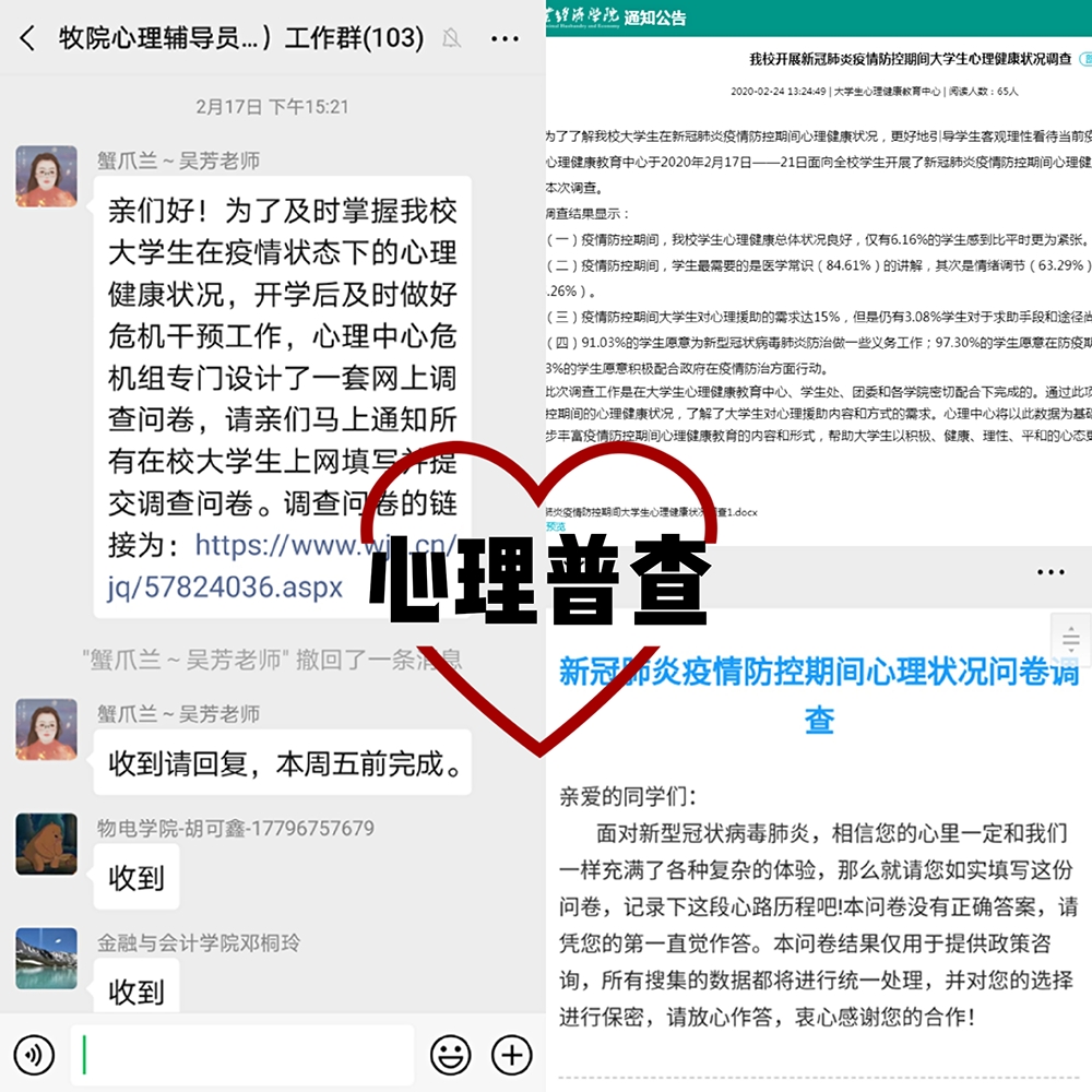 大学生心理健康教育中心从1月28日起全员开启值班模式,编写并发布《新冠病毒防控期间心理防护指南》,利用网站、微信、QQ群等各种渠道,做好针对疫情的心理防护宣传教育。