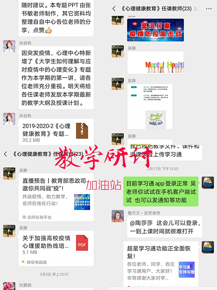 大学生心理健康教育中心为做好延迟开学期间网络教学相关工作,多次召开网络教学研讨会议,并结合疫情下的社会心态,为我校学生特设心理健康教育课程首讲内容-------《大学生如何理解和应对疫情中的心理变化》,帮助学生了解疫情中会出现的各类情绪状态,缓解焦虑感,无力感等负面情绪,引导学生树立积极心态应对疫情,调整生活节奏,保持身心健康。