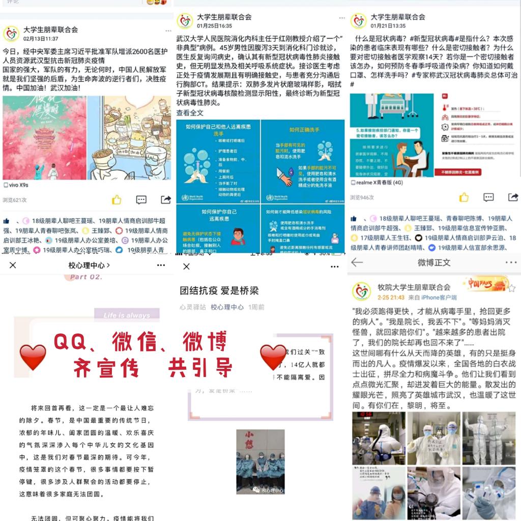 战“疫”打响后,各学院心理健康教育二级工作站积极响应校大学生心理健康教育中心的号召,积极开展防疫知识宣传,加强对学生的心理关怀和疏导,为我校学生筑牢心理防线,提升心理免疫力保驾护航。