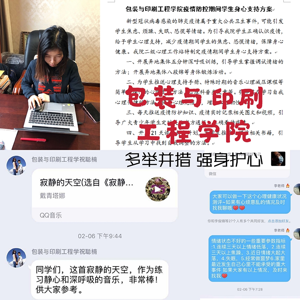 包装与印刷工程学院制定方案,通过开展异地集体五分钟深呼吸训练,引导学生掌握调试情绪的方法;开展异地集体八段锦等身体锻炼活动;为学生推送心理支持手册、特殊时期的音乐心理减压课程等简单易操作的心理支持方法、心理科普类文章等,引导广大学生学习自我心理保健的方法,提高心理免疫力,增加心理韧性。