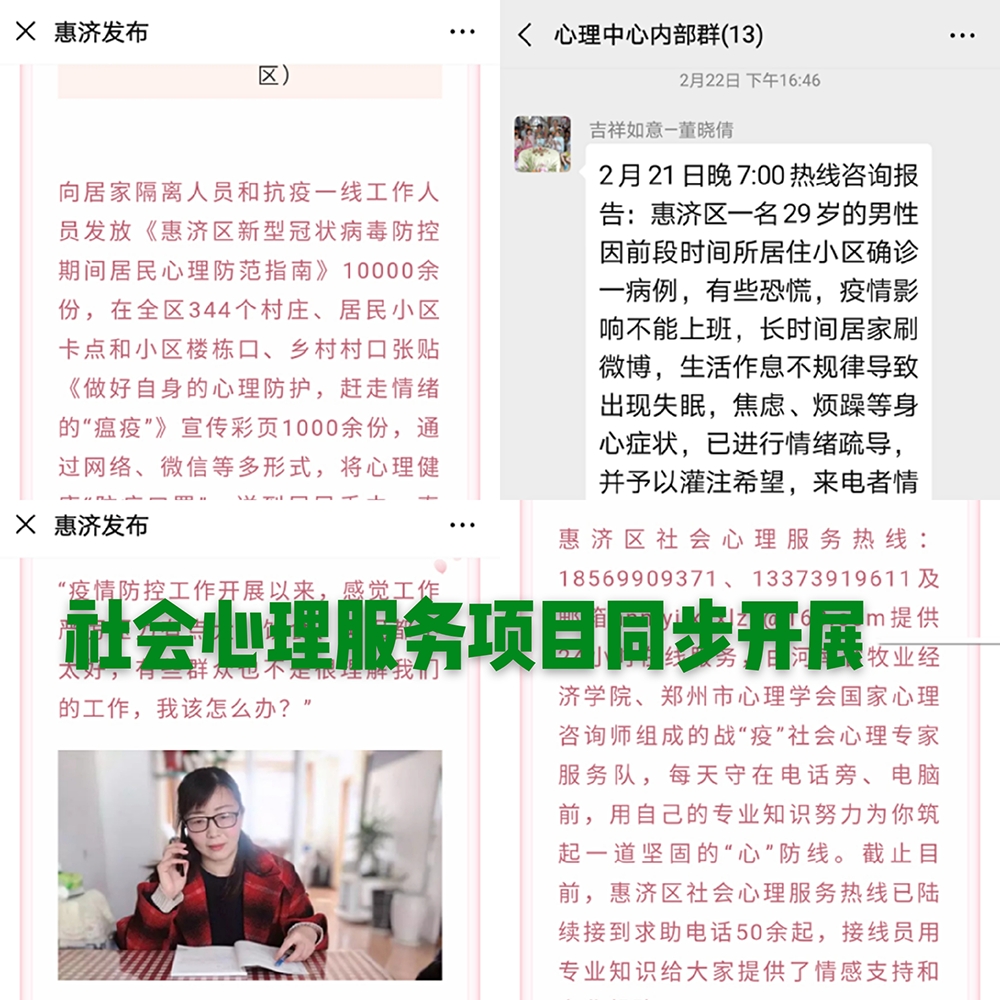 自1月29日起,大学生心理健康教育中心开通24小时心理援助热线电话18569909371,面向全校师生和惠济区广大群众开展疫情相关心理支持及危机干预工作,帮助师生和公众树立积极、平和、理性心态。