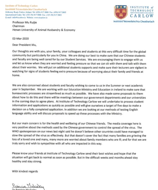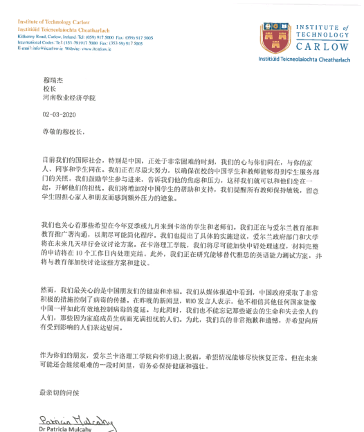 爱尔兰卡洛理工学院校长Dr Patricia Mulcahy在来信中表示,目前国际社会特别是中国正处于新冠肺炎疫情防控非常困难的时刻,我们的心与你们同在,与你的家人、同事和学生同在。爱尔兰卡洛理工学院会尽最大努力,照顾好我校在爱尔兰卡洛理工学院留学的学生和研修学习的教师,帮助他们渡过难关。Dr Patricia Mulcahy还表达了对中国政府和人民取得抗击疫情胜利的信心,对中国朋友们的健康和幸福表示关心,并祝愿中国及学校抗击新冠肺炎疫情工作早日取得成功。