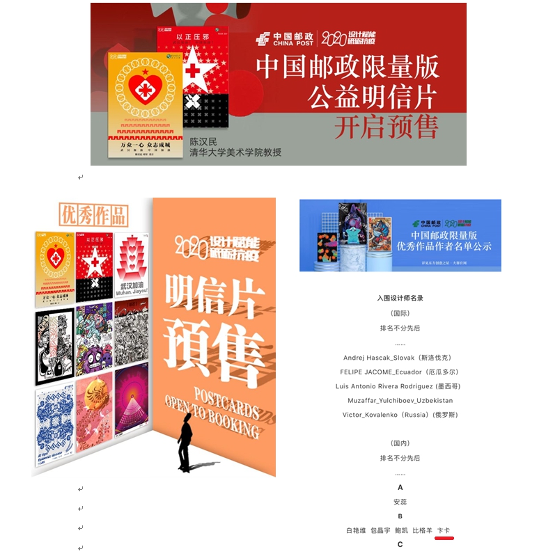 活动受到社会各界热情高涨的参与者踊跃投稿,大赛组委会共收到国内外两万多名设计师创作的近三万件作品,其中不乏设计界泰斗级大师陈汉民等前辈,也有众多享有盛誉的设计工作室和独立设计师的投稿。经过评审委员会专家审慎评选,433件优秀作品进入本次中国邮政定制版公益明信片作品库。我校艺术学院教师卞卡老师的作品有幸入库。