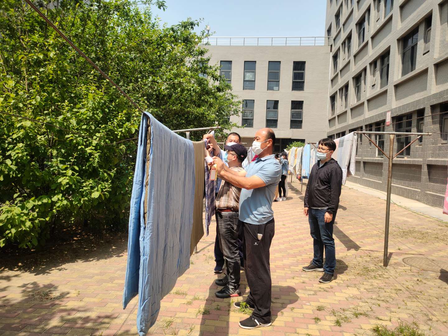 上午9:00,各学院根据各自学生分布情况,分三校区集中开展晾晒被褥、浇绿植等活动,公寓管理人员对学生公寓开展保洁、消杀工作。天气虽然炎热,但老师们积极协作,分工明确,一趟趟地往返宿舍和晾晒场地,擦栏杆、取被子、贴标签、晒被子,并精心帮助毕业生整理房间,用实际行动欢迎同学们返校复学。校园里处处都是老师们忙碌的身影,与五颜六色的被褥形成了别样的风景线。