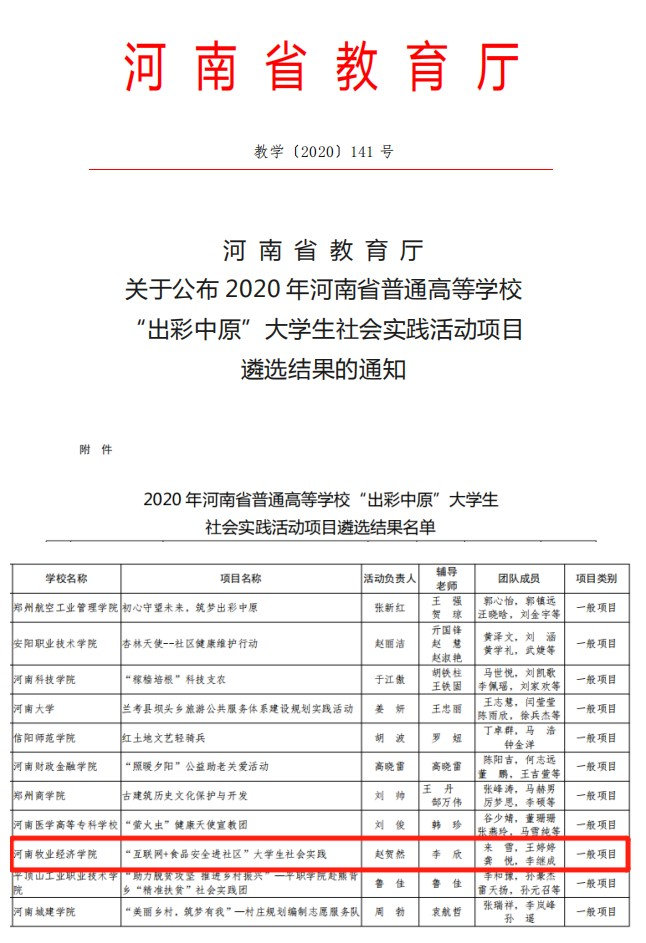 为实现大学生社会实践活动科学化、品牌化、项目化,河南省教育厅组织开展了2020年河南省普通高等学校“出彩中原”大学生社会实践活动项目遴选工作,5月8日,河南省教育厅教学〔2020〕141号文件公布了项目遴选结果,我校报送的“互联网+食品安全进社区”大学生社会实践项目获批立项。