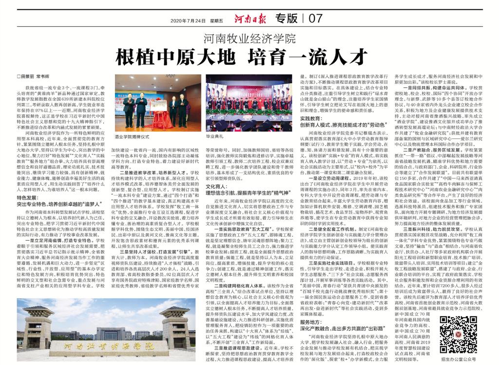 7月24日,《河南日报》以《根植中原大地 培育一流人才》为题报道我校全面贯彻党的教育方针,紧紧围绕立德树人根本任务,坚持扎根中原大地办大学,坚持以学生为中心,突出教学的中心地位,聚力打好“特色发展”“文化育人”“实践教育”“服务地方”组合拳,大力培养具有崇高理想信念和良好道德品质,理论功底扎实、技术技能突出、继续学习能力较强,具有创新精神、就业能力、健康体魄,能够创造幸福美好生活的高素质应用型人才相关情况。(相关链接:http://newpaper.dahe.cn/hnrb/html/2020-07/24/content_433131.htm)。全文转载如下: