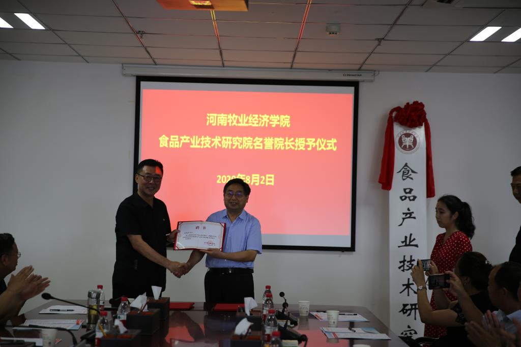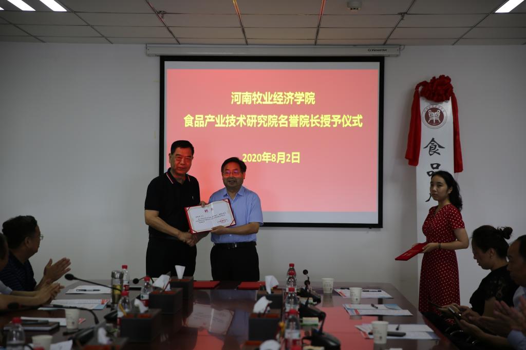 校党委书记穆瑞杰和省工业和信息化厅食品工业办公室主任许新共同为食品产业技术研究院揭牌,并授予陈振杰和吴祖兴为研究院名誉院长。副校长张卫宪代表学校与河南省金米郎食品有限公司、河南思迈尔健康科技有限公司签订总金额为401万元的横向科研项目。