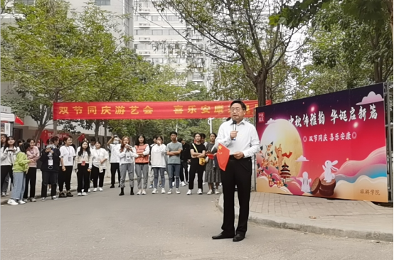 在“双节”同庆游艺会现场,校长罗士喜发表现场即兴演讲,并与同学们一同观看表演,共唱《歌唱祖国》,用歌声表达对祖国的祝福与热爱。