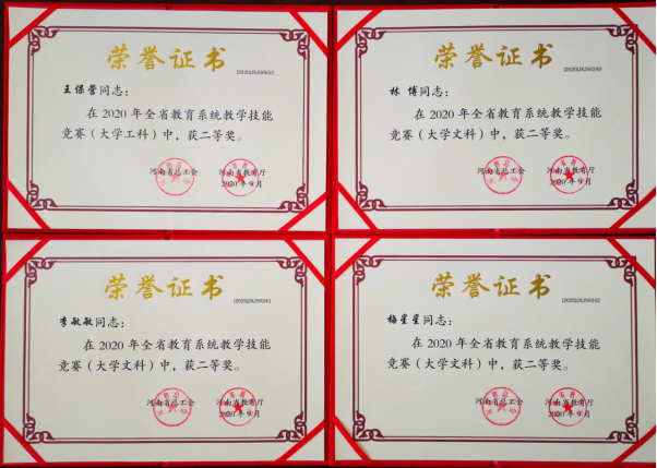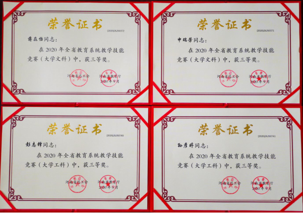 日前,河南省总工会、河南省教育厅联合下发《关于表彰2020年全省教学技能竞赛获奖单位和个人的决定》,我校教师在2020年全省教学技能竞赛中荣获5个一等奖、4个二等奖、4个三等奖的优异成绩;学校被授予“2020年全省教学技能竞赛优秀组织单位”荣誉称号,是全省获此殊荣的八所高校之一。