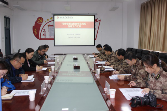 学工部部长王清龙立足我校工作实际,从校党委高度重视、制度建设完备、征兵工作成绩突出、学生军训和军事理论课开展规范有序等方面对“河南省国防教育模范高校”创建工作的基本情况进行具体汇报。