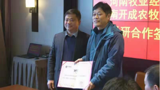 在热烈愉快的气氛中,tyc8722太阳集团城社会服务办主任胡迎利与河南开成投资集团董事长胡启成,分别代表学校和开成农牧签署了合作协议,开成农牧聘请动物科技学院刘健副教授为公司“技术总监”,并颁发了聘书。