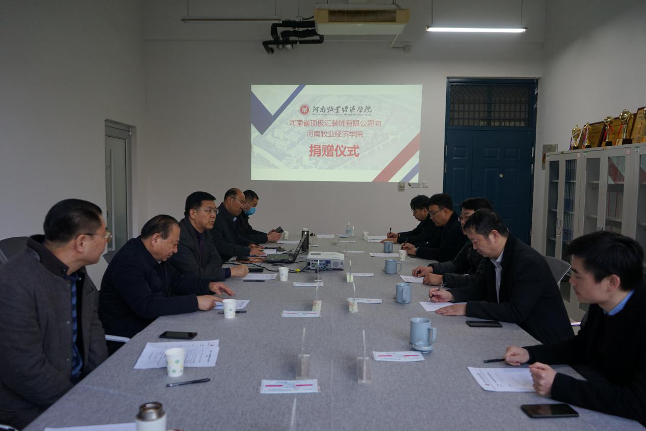12月10日上午,我校校企合作单位河南省顶级汇装饰设计有限公司与学校签订资金捐赠协议,该公司捐赠50万元用于产业学院建设工作。仪式在龙子湖校区一号教学楼200-1室举行,副校长张卫宪、“顶极汇”有限公司董事长熊书国、总经理孙希明等领导出席仪式,校财务处、社会服务办公室负责人,艺术学院领导班子成员等同志参加,签字仪式由社会服务办公室主任胡迎利主持。