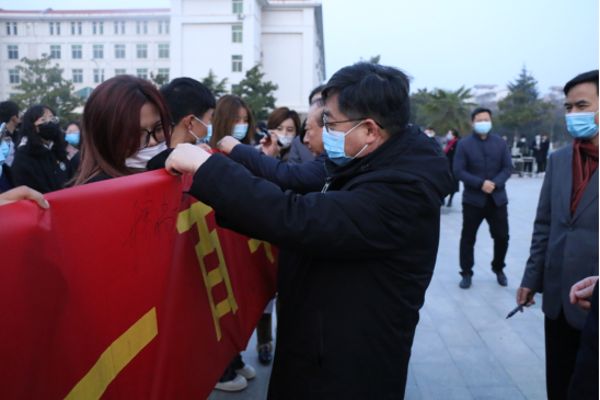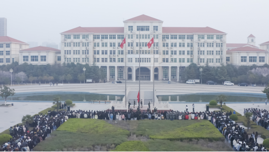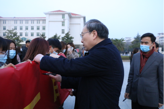 3月8日早上7点,由校党委学工部、校团委共同举办的“青春聚力迎评估 献礼建党一百年”主题升旗仪式在三校区同时开展。校党委书记穆瑞杰、校长罗士喜,副校长张卫宪、张伟、杨志清、姚毅出席升旗仪式,各二级学院党委书记、院长,党委副书记,团委书记,辅导员老师,学生处、校团委全体人员及1500名学生代表参加。升旗仪式由校团委书记杨莉主持。