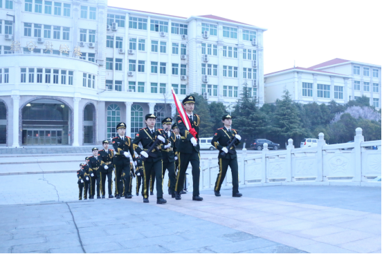 在铿锵有力、整齐划一的脚步声中,国旗仪仗队来到升旗台前护卫国旗。在雄壮的义勇军进行曲中,五星红旗冉冉升起。现场领导及师生代表庄严肃立,面向五星红旗高唱国歌。