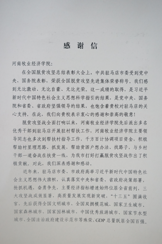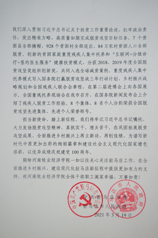 近日,中共驻马店市委、驻马店市人民政府向我校发来感谢信,感谢我校对驻马店市脱贫工作作出的积极贡献。