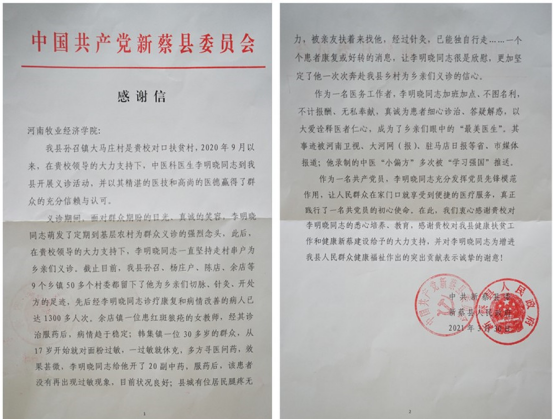 近日,中共新蔡县委、新蔡县人民政府向我校发来感谢信,感谢我校对新蔡县健康扶贫工作和健康新蔡建设给予的大力支持,感谢我校中医科医生李明晓同志为增进新蔡县人民群众健康福祉作出的积极贡献。