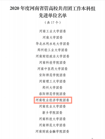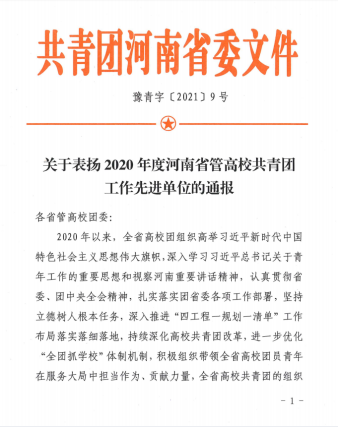 近日,团省委下发《关于表扬2020年度河南省管高校共青团工作先进单位的通报》,我校获评2020年度河南省管高校共青团工作本科组先进单位,是河南省获评先进单位本科组17所高校之一。