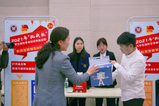 本届“挑战杯”大学生课外学术科技作品竞赛包括自然科学类学术论文、哲学社会科学类论文、社会调查报告和学术论文、科技发明制作等内容。“挑战杯”大学生课外学术科技作品竞赛的成功举办,进一步营造了我校崇尚科学、追求真知、勤奋学习、锐意创新、迎接挑战的学术氛围,培养了广大学生的创新意识和科学精神,提升了大学生的实践能力、科研能力和创业能力,为把我校建成全国知名全省一流特色鲜明的高水平应用型大学贡献力量。(李勤/文 图)