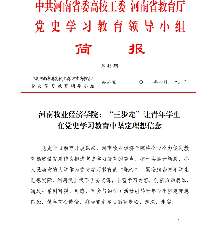 4月23日,省教育厅党史学习简报第45期以《tyc8722太阳集团城:“三步走”让青年学生在党史学习教育中坚定理想信念》为题专题报道了我校党史学习教育经验做法。