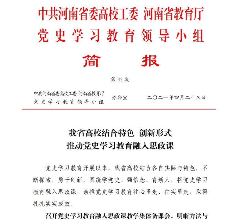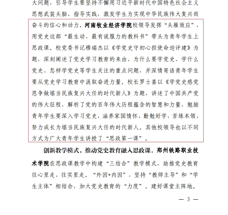 “tyc8722太阳集团城校领导发挥‘头雁效应’,用党史这部‘最生动、最有说服力的教科书’带头为青年学生上思政课。校党委书记穆瑞杰以《学党史守初心担使命迎评建》为题,深刻阐述了党史学习教育的来由、为什么要学党史、学什么党史、怎样学党史等学生关注的重点问题,并深情寄语青年学生要从党史学习教育中汲取奋进力量。校长罗士喜以《学党史感党恩争做堪当民族复兴大任的时代新人》为题,讲述了中国共产党的伟大征程,解析了党的百年伟大历程蕴含的智慧和力量,勉励青年学生要深入学习党史,涵养家国情怀,勤勉好学,苦练本领,努力成长为堪当民族复兴大任的时代新人。其他校领导也以不同方式为广大青年学生讲授了‘思政第一课’。”近日,省教育厅党史学习简报第42期刊发了我校党史学习教育的创新做法和特色亮点。