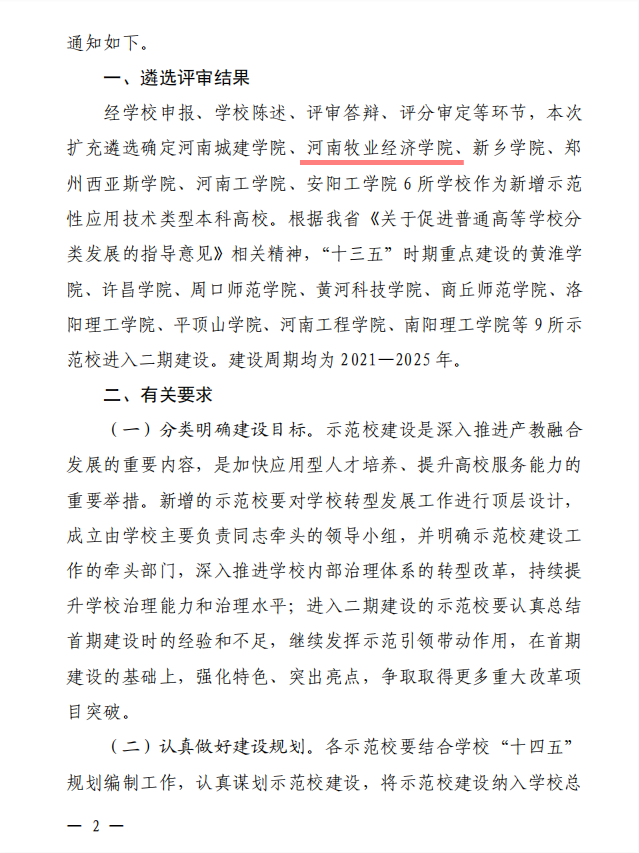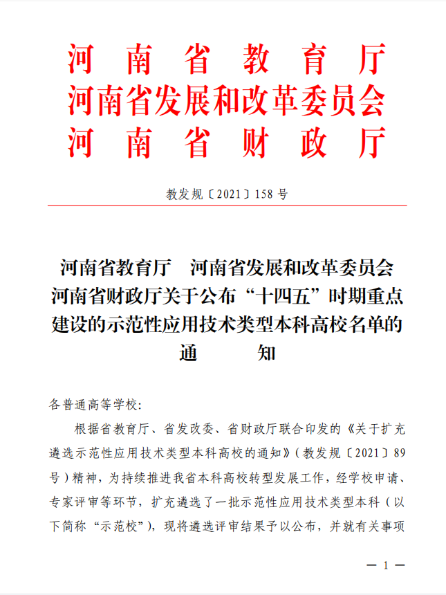 近日,河南省教育厅、河南省发展和改革委员会、河南省财政厅联合发布《关于公布“十四五”时期重点建设的示范性应用技术类型本科高校名单的通知》(教发规〔2021〕158号),确定我校为河南省示范性应用技术类型本科高校。