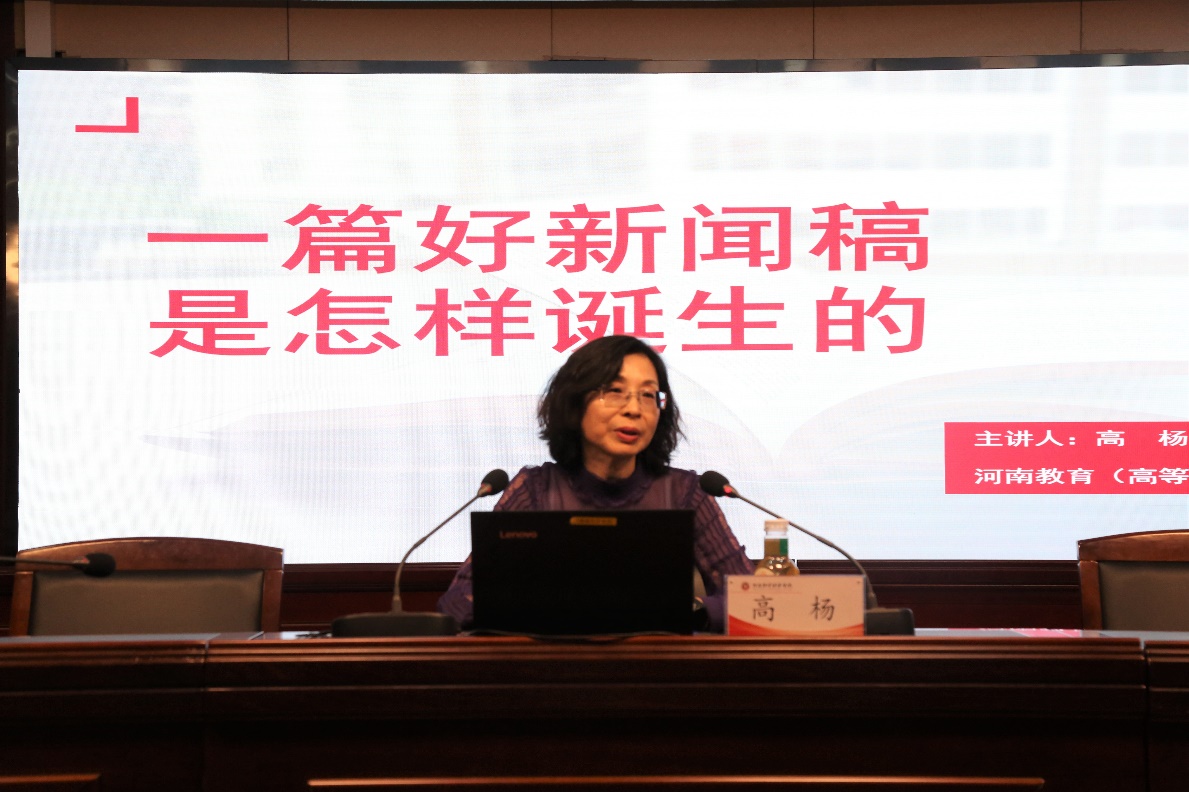 高杨作首场专题讲座。她结合新时代党的宣传工作要求,从什么是新闻、好新闻的标准、写好新闻稿的几个关键等方面阐述。高杨以去往深山采访民间教师的经历为例,指出新闻工作者要接地气,能吃苦,深入采访,不畏艰难;要修炼“内功”,不断增强脚力、眼力、脑力、笔力;要善用“外力”,创新传播手段和话语方式。