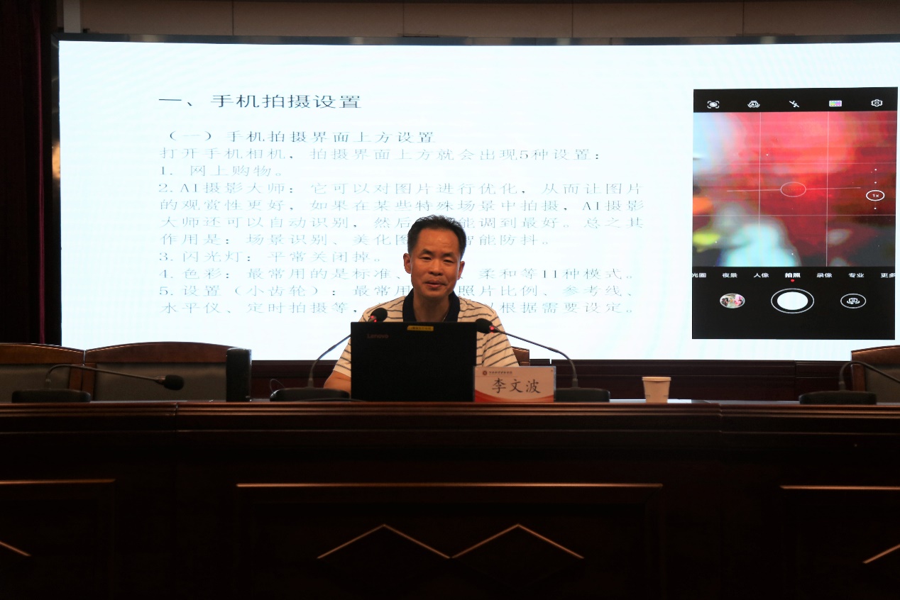 李文波以《手机摄影——拍出身边的精彩》为题,从手机摄影基础知识、如何拍好会议图片、树立图片编辑意识、手机摄影作品欣赏等四个方面,用图文并茂的形式进行了深入浅出的讲解,并结合他自己的创作给我们带来一场视觉盛宴。