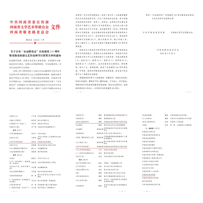 近日,由中共河南省委宣传部、河南省文学艺术界联合会、河南省敬老助老总会联合开展的“永远跟党走”庆祝建党100周年敬老助老原创文艺作品和节目征集活动圆满落下帷幕,在全省报送的792个原创文艺作品和节目中,我校报送的原校党委副书记李绍文的《百年百句祝华诞》原创诗歌和舞蹈《再唱山歌给党听》、集体诗朗诵《百年百句祝华诞》两项文艺节目脱颖而出,均荣获银奖,我校荣获组织奖,是全省高校中的最好成绩。