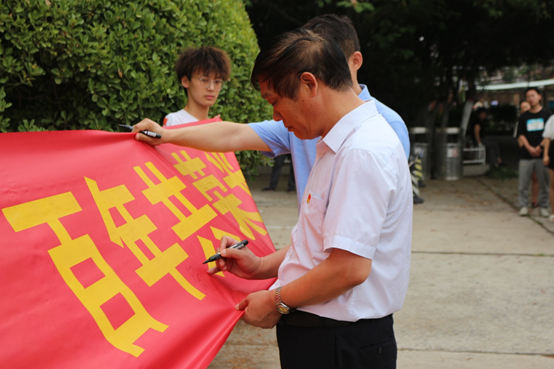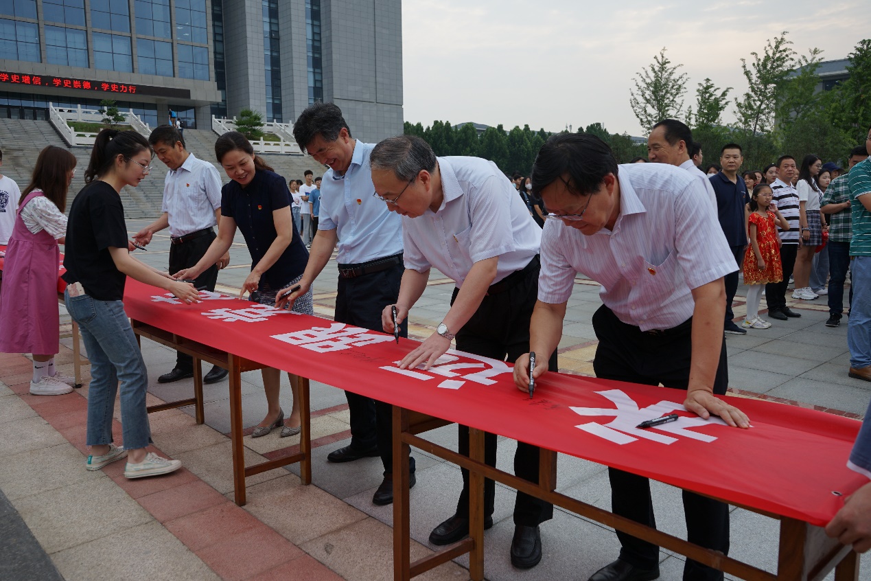 仪式后,穆瑞杰带领师生在“青春心向党 百年共荣光”条幅上签名。