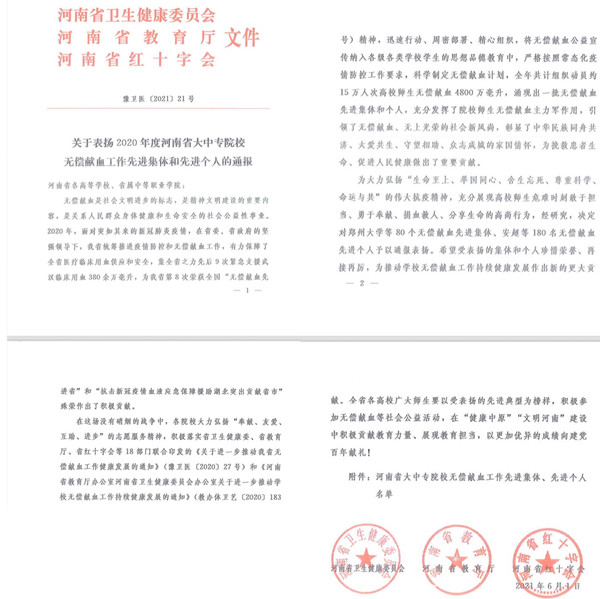 近日,河南省卫生健康委员会、河南省教育厅、河南省红十字会联合发布了《关于表扬2020年度河南省大中专院校无偿献血先进工作集体和先进个人的通报》(豫卫医﹝2021﹞21号),我校荣获“河南省大中专院校无偿献血特殊贡献奖”,我校能源与智能工程学院党委书记周凯、2018级能源与动力工程学生化耀泽分别荣获“河南省大中专院校无偿献血先进个人”称号。