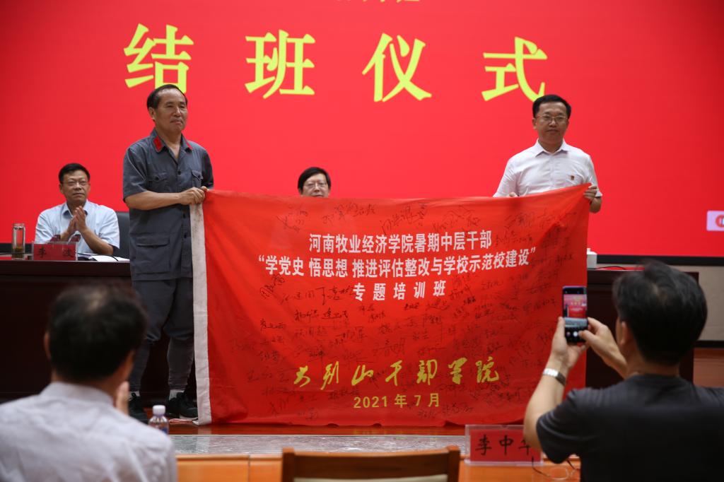 大别山干部学院党委委员、纪委书记刘万金为学员代表颁发了结业证书;校党委委员、宣传部部长、培训班宣传委员兼学习委员王凌彬代表班级回赠了集体签名班旗。