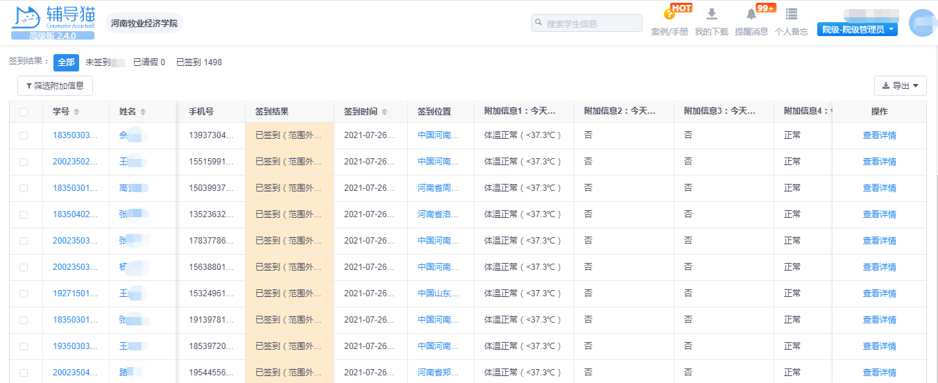 各二级学院学工一线的同志密切关注学生动态,通过辅导猫APP系统,每日全面摸排学生信息,及时了解掌握受灾较重地区学生的有关情况,查看学生安全健康情况,解决学生出现的各类问题。