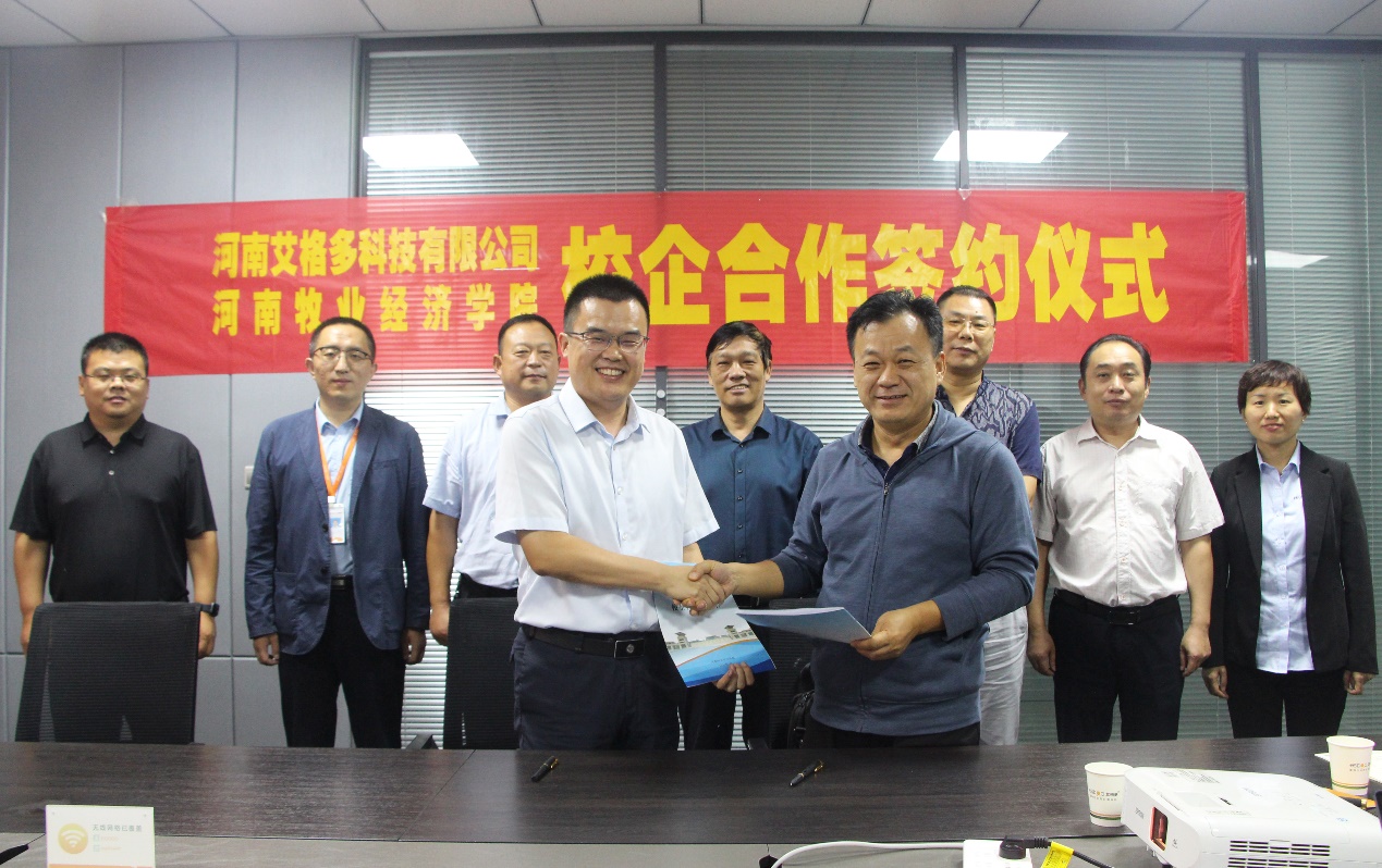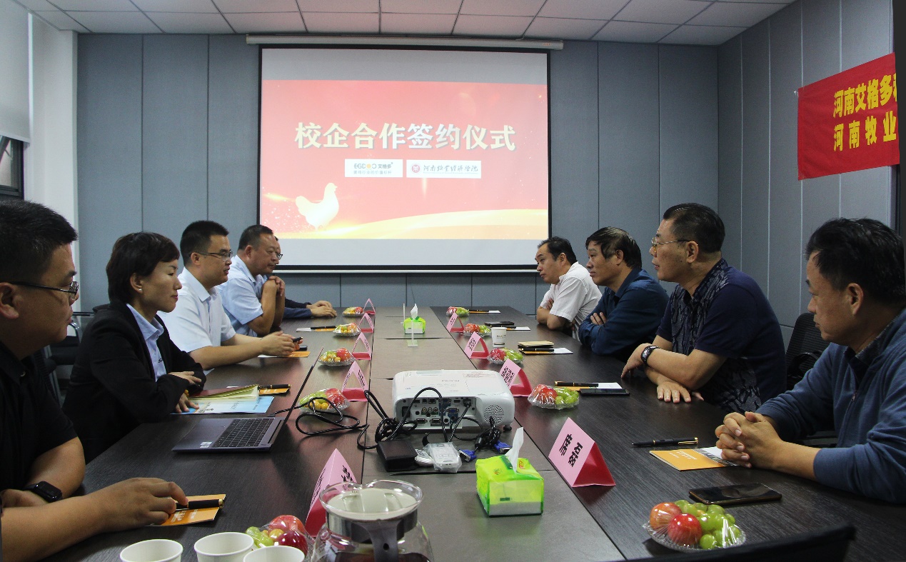 双方签署了校企合作协议书。河南艾格多科技有限公司是一家集饲料核心技术研究、人工智能设备开发、农牧管理软件开发、饲料生产与销售的全国性企业,着重于蛋鸡营养和养殖新技术的研究及实用技术推广,拥有15个发酵多矿发明专利,2个发酵中药发明专利,2个畜禽舍小环境智能控制实用新型专利和2个鸡场管理软件著作权等众多研究成果。