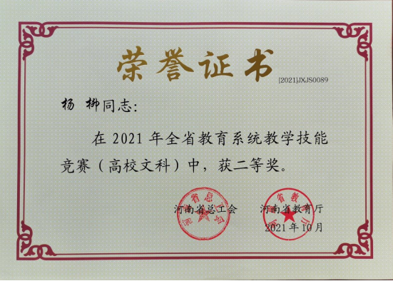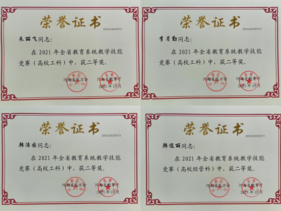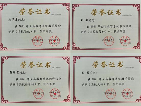 日前,从河南省总工会、河南省教育厅联合下发的《关于表彰2021年全省教学技能竞赛获奖单位和个人的决定》(豫工文〔2021〕89号)中获悉,我校教师在2021年全省教学技能竞赛中荣获4个一等奖、5个二等奖、4个三等奖的优异成绩。