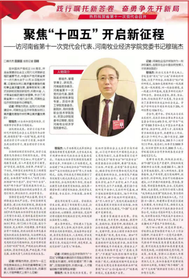 10月29日,在河南省第十一次党代会召开期间,省第十一次党代会代表、我校党委书记穆瑞杰接受河南日报农村版记者专访,以《聚焦“十四五” 开启新征程》为题,穆瑞杰就高质量党建推动高校事业高质量发展;落实立德树人根本任务,改革创新人才培养模式;锚定“两个确保”,实施创新驱动、科教兴省、人才强省战略高校举措;在服务社会中发挥高校人才资源优势四方面回答了记者采访。河南日报农村版刊发专访文章。