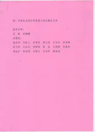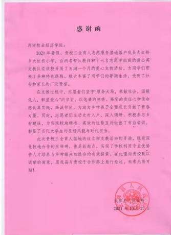 10月27日,武陟县人民政府向我校发来感谢函,感谢我校在当地建设“三全育人”志愿服务实践基地,并选派“蒲公英支教团”开展支教活动。